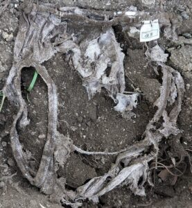 ちなみに同じ畑の「バイオの惠」を混ぜていない部分に埋めたパンツは6週間後もほとんど分解されていませんでした。